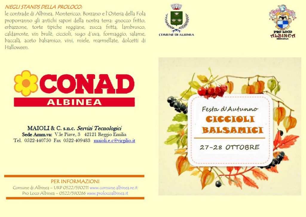 Con la Festa d’Autunno dei “Ciccioli balsamici”, in programma sabato 27 e domenica 28 ottobre, tornerà ad Albinea un importante appuntamento con i prodotti tipici della tradizione reggiana e con il divertimento. Il tutto grazie ai volontari della Pro Loco.