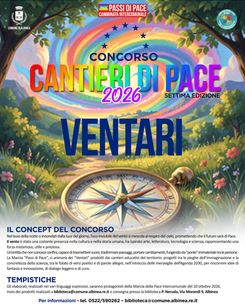 Così, una volta concluso il concorso, la Marcia “Passi di Pace” si animerà dei “Ventari” prodotti dai cantieri educativi del territorio: progetti tra le pieghe dell’immaginazione e la concretezza della scienza, tra le folate di versi poetici e di parole allegre, nell’intreccio delle meraviglie dell’Agenda 2030, per rincorrere idee di fantasia e innovazione, di dialogo leggero e di cura.