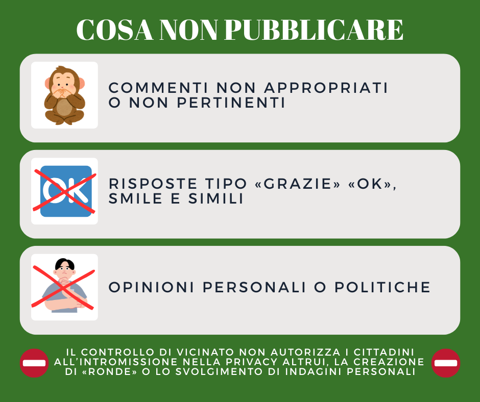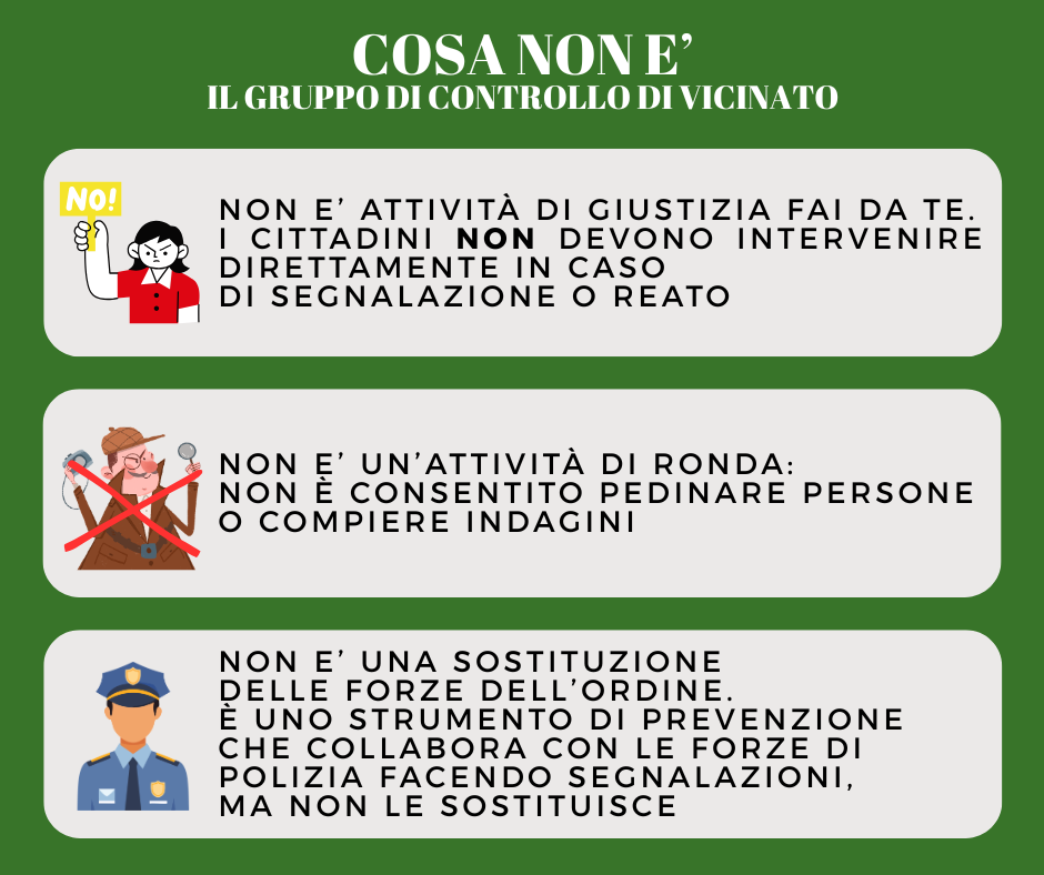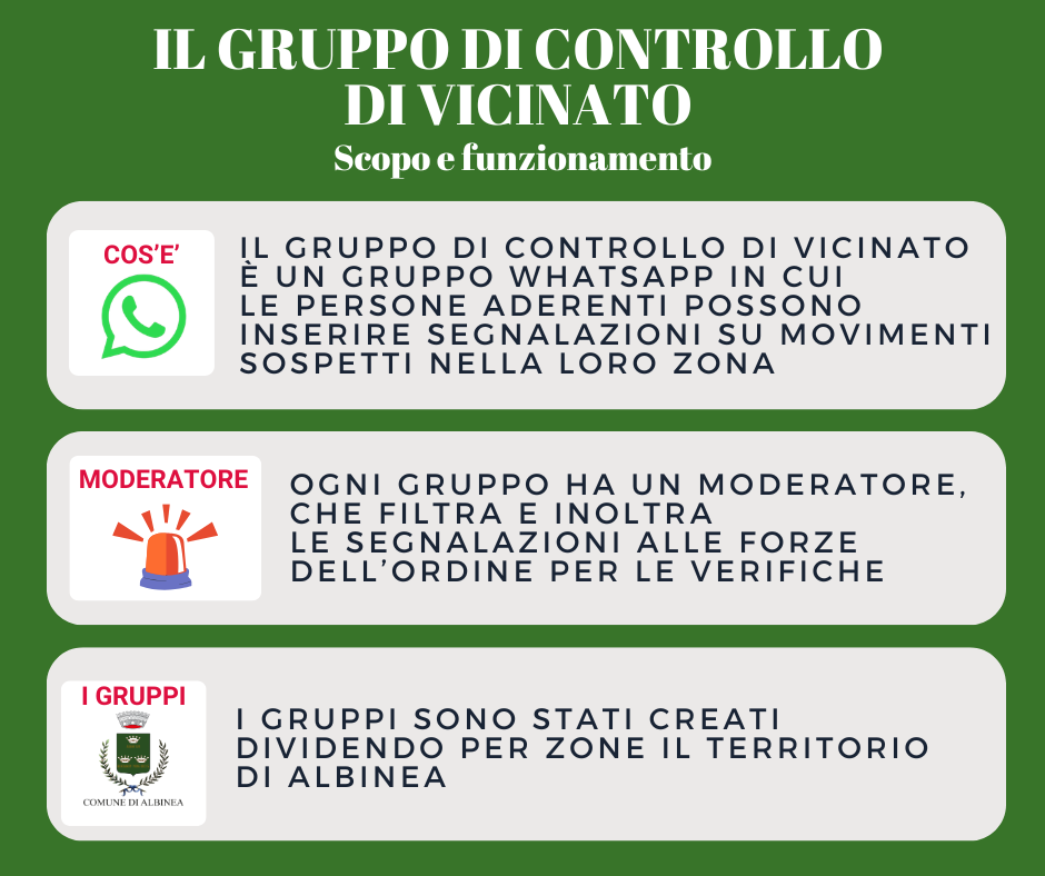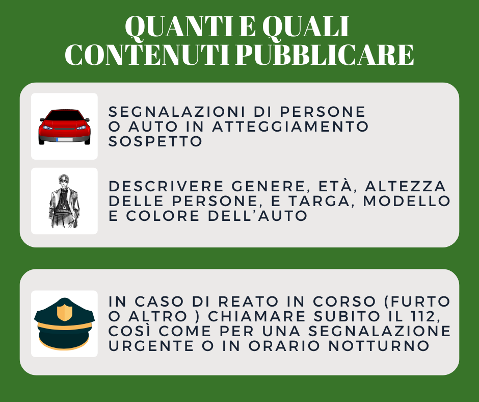 Nei gruppi i cittadini potranno segnalare attività/persone/mezzi sospetti, furti o tentati furti, truffe.