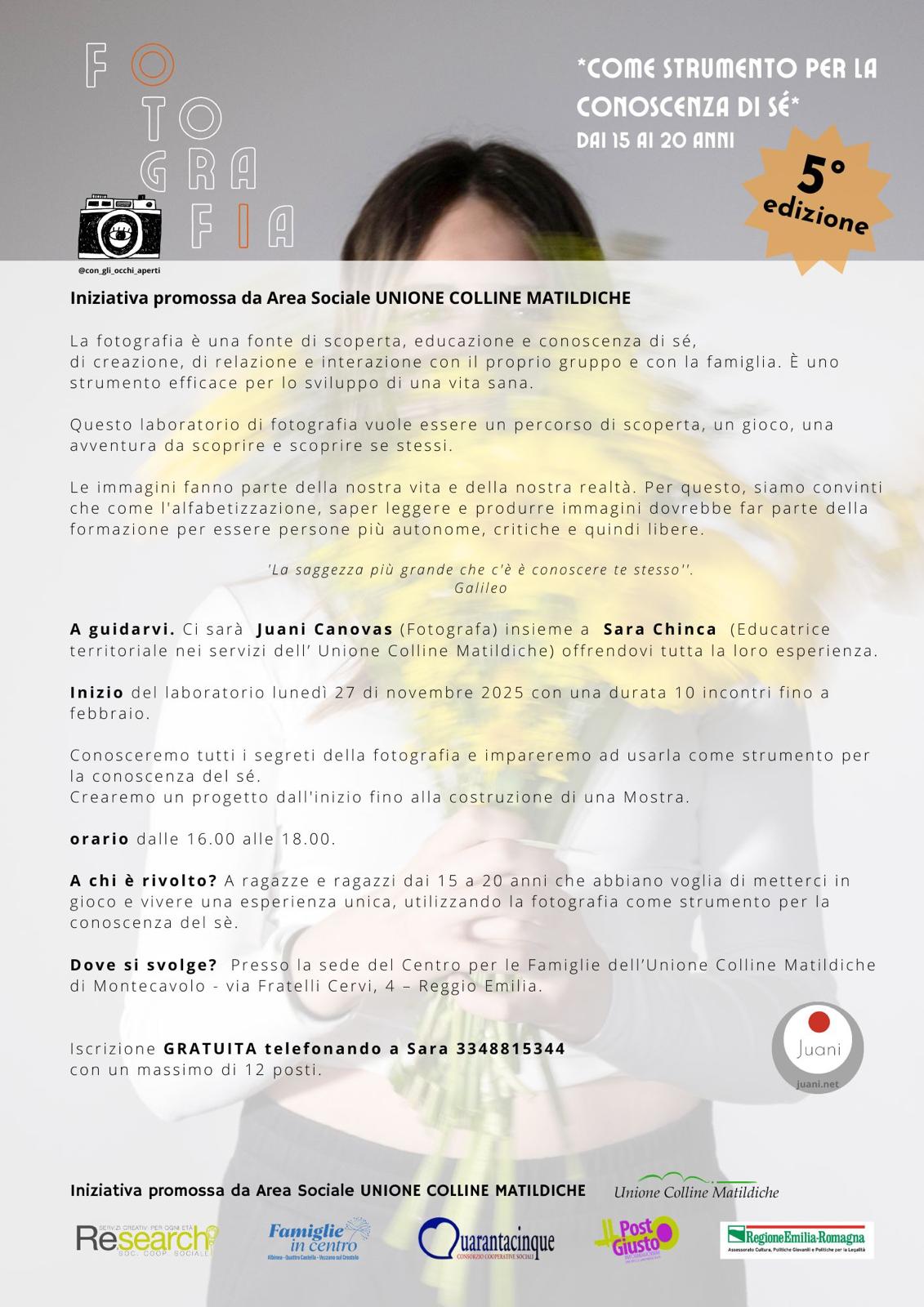 “Come uno strumento per la conoscenza di sé” è il laboratorio di fotografia, promosso dall’area sociale dell’Unione Colline Matildiche, dedicato ai ragazzi e alle ragazze dai 15 ai 20 anni, che arriverà quest’anno alla sua quinta edizione.