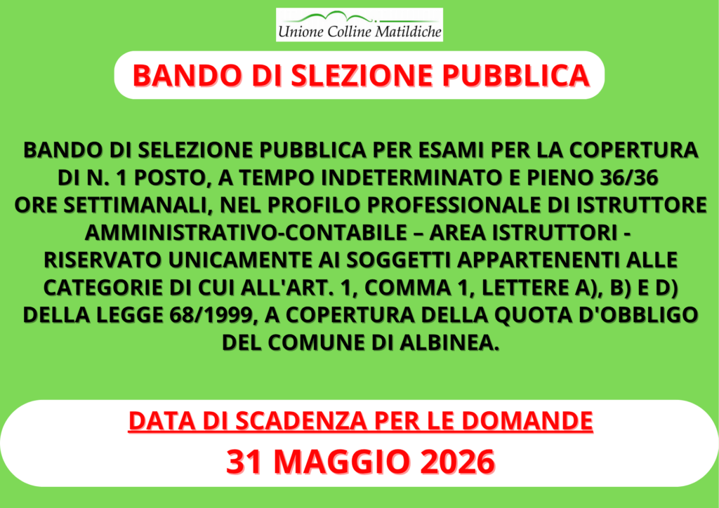 Bando di selezione pubblica per esami per la copertura di 1 posto, a tempo indeterminato e pieno 36/36 ore settimanali, nel profilo professionale di Istruttore amministrativo-contabile – Area istruttori – riservato unicamente ai soggetti appartenenti alle categorie di cui all’Art. 1, comma 1, lettere a), b) e d) della legge 68/1999, a copertura della quota d’obbligo del Comune di Albinea.