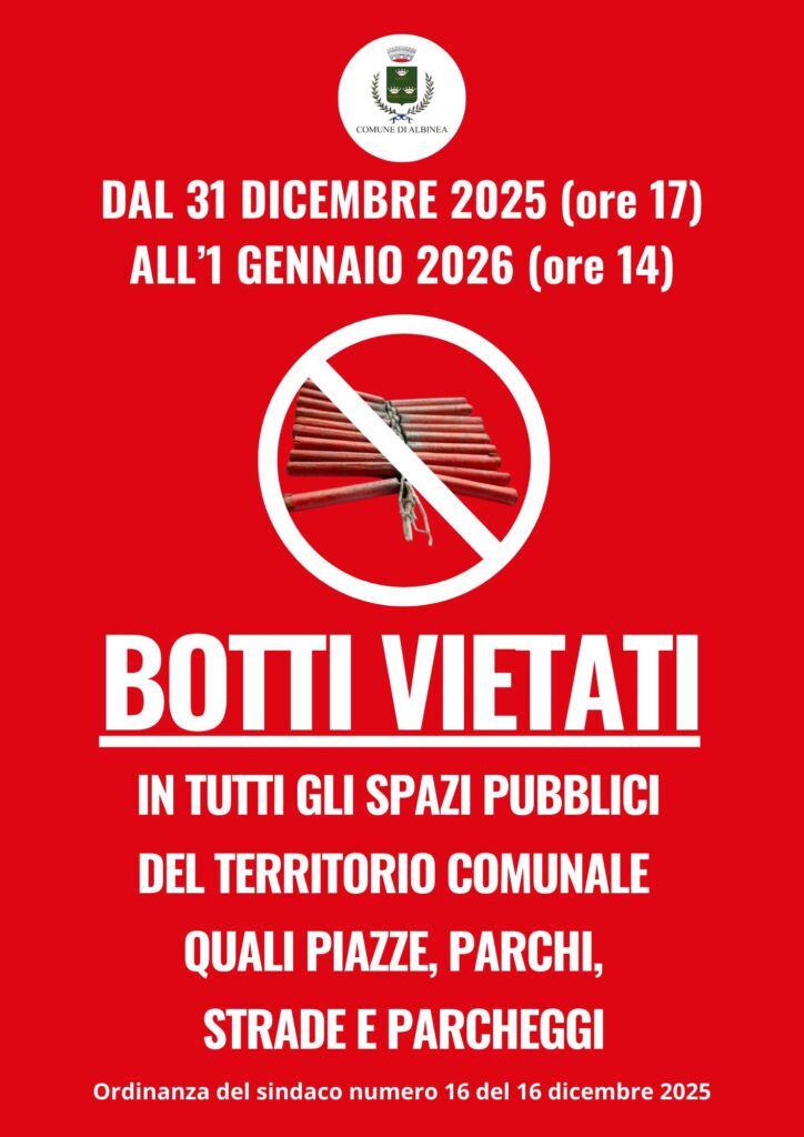 Dalle ore 17 del 31 dicembre 2025 e fino alle ore 24 del 1° gennaio 2026, nel territorio del Comune di Albinea è quindi vietato l’accensione e lancio di fuochi artificiali, sparo di petardi, scoppio di mortaretti, razzi e altri artifizi pirotecnici in piazze, parchi pubblici, strade e parcheggi, così come in tutti i luoghi aperti dove transitino o siano presenti persone. Inoltre i cittadini, che usino questi materiali in aree private, sono invitati a mettere in atto tutte le azioni idonee a prevenire eventuali situazioni di pericolo a persone e animali.