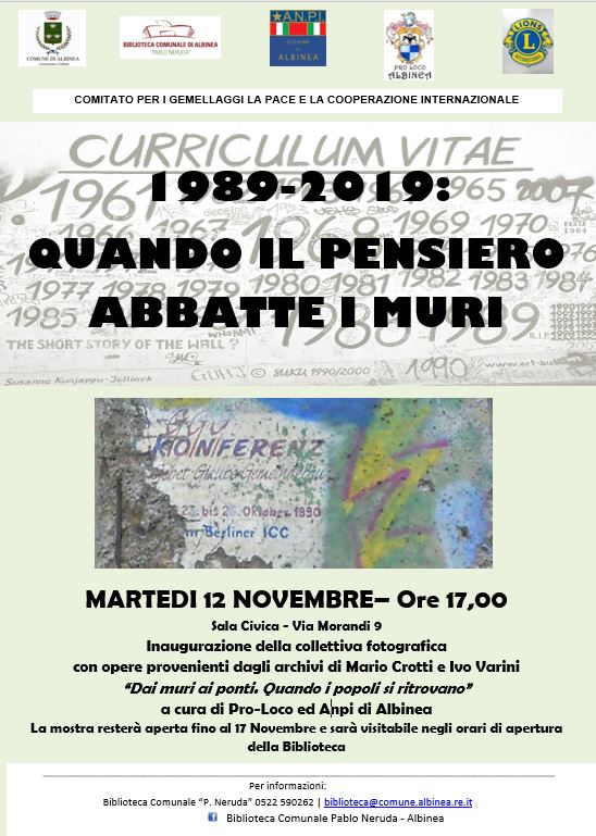 Prima la proiezione del documentario dal titolo “Die Mauer – The Wall”, con la regia di Jurgen Bottcher, poi il dialogo tra il consigliere comunale Tiziano Cattani e Torsten Thesenvitz, testimone della riunificazione della Germania. Si concluderanno così, domenica 17 novembre, le celebrazioni per il 30ennale della caduta del Muro di Berlino organizzate ad Albinea […]