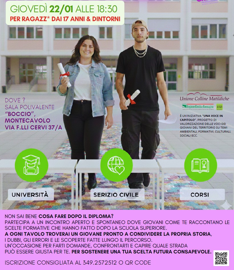 Non si sa bene cosa fare dopo il diploma? L’Informagiovani Infolavoro dell’Unione Colline Matildiche ha organizzato una serata aperta in cui ragazzi e ragazze si incontreranno per condividere la loro esperienza dall’università ai corsi della rete politecnica, dal lavoro, al tirocinio extra curriculare al servizio civile e tanto altro ancora.