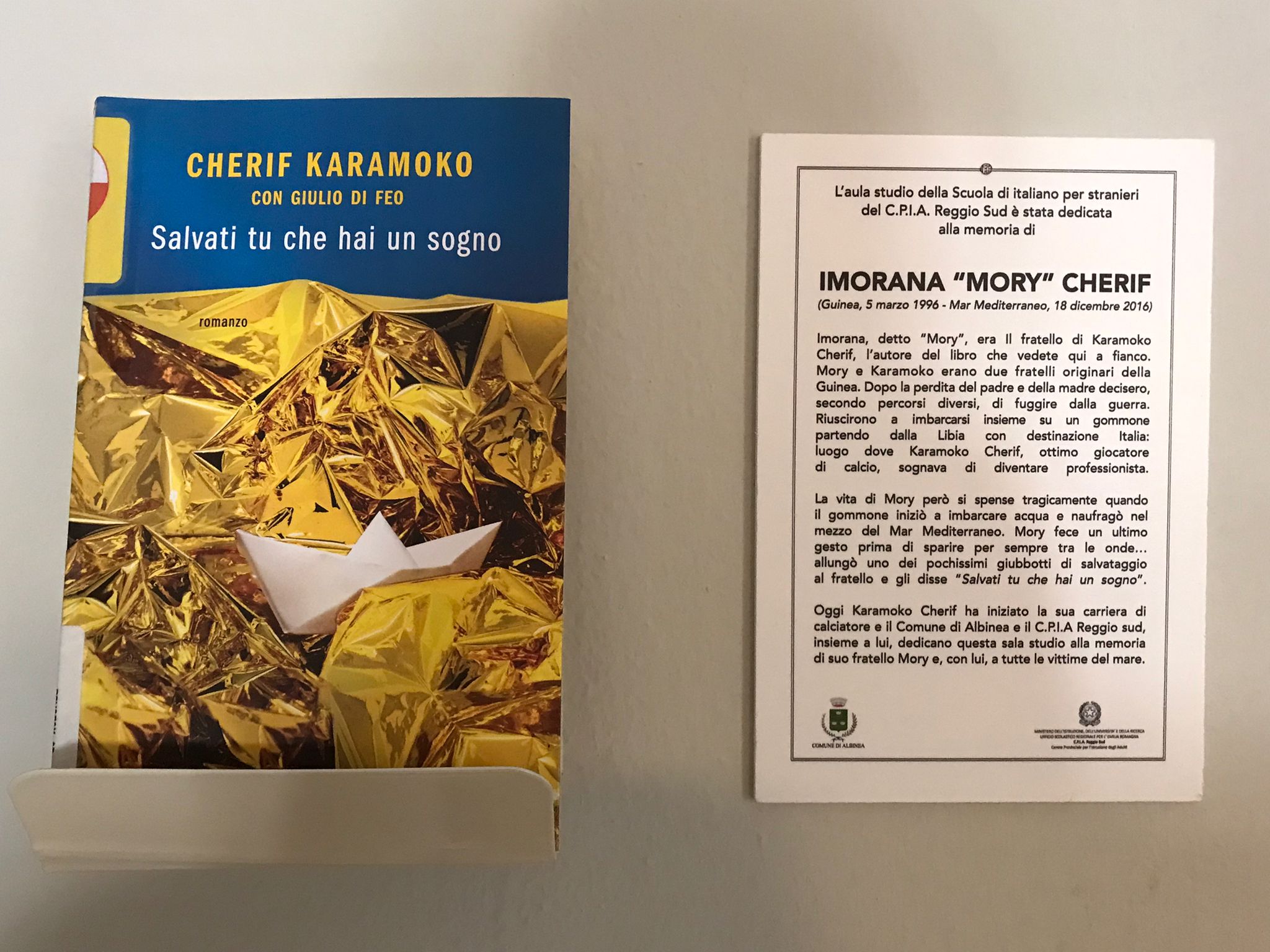 Mory e Karamoko erano due fratelli originari della Guinea. Dopo la perdita del padre e della madre decisero, secondo percorsi diversi, di fuggire dalla guerra. Riuscirono a imbarcarsi insieme su un gommone partendo dalla Libia con destinazione Italia: luogo dove Karamoko Cherif, ottimo giocatore di calcio, sognava di diventare professionista. La vita di Mory però si spense tragicamente quando il gommone iniziò a imbarcare acqua e naufragò nel mezzo del Mar Mediterraneo. Mory fece un ultimo gesto prima di sparire per sempre tra le onde… allungò uno dei pochissimi giubbotti di salvataggio al fratello e gli disse “Salvati tu che hai un sogno”. Oggi Karamoko Cherif ha iniziato la sua carriera di calciatore e il Comune di Albinea e il C.P.I.A Reggio sud, insieme a lui, dedicano questa sala studio alla memoria di suo fratello Mory e, con lui, a tutte le vittime del mare”.