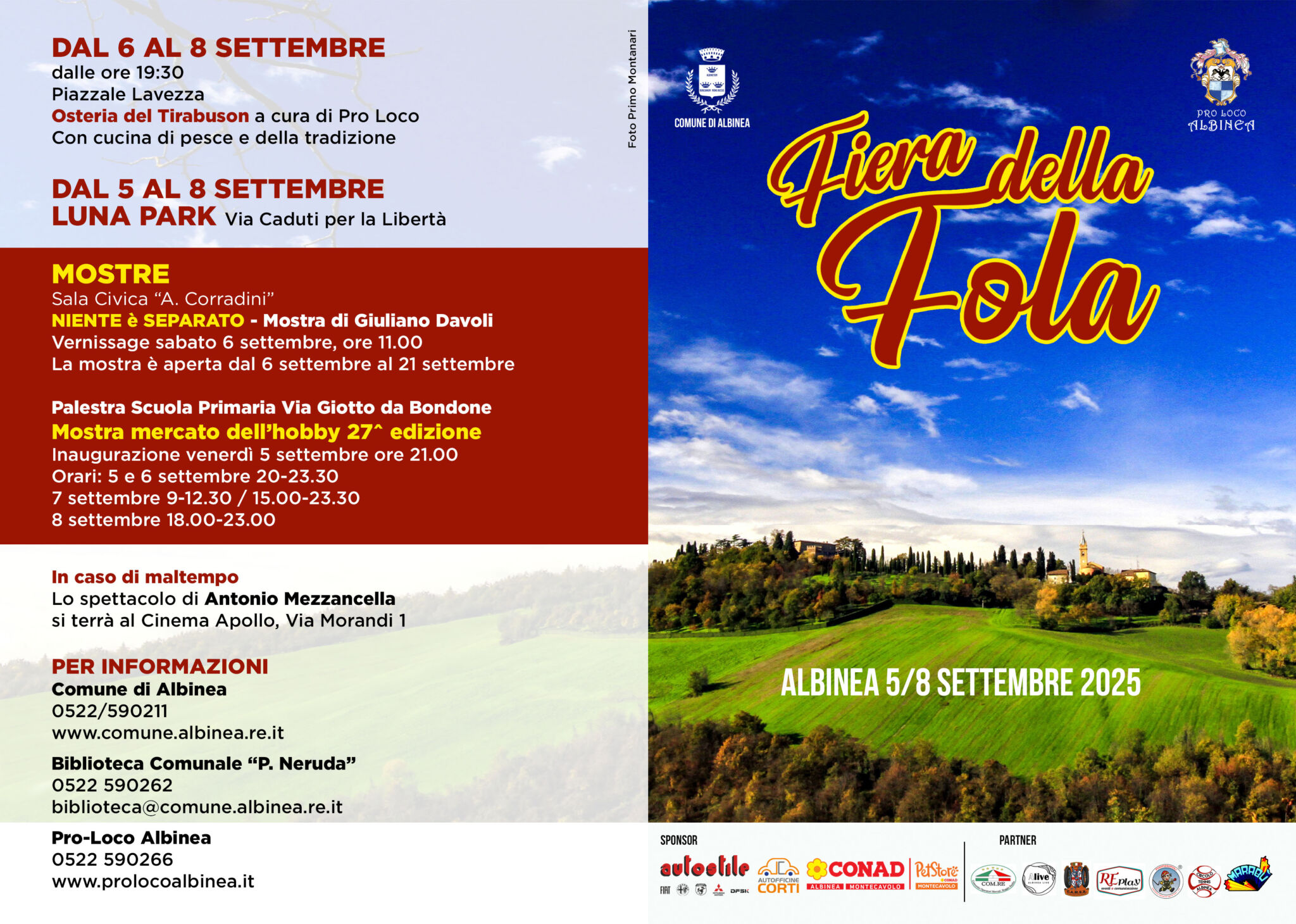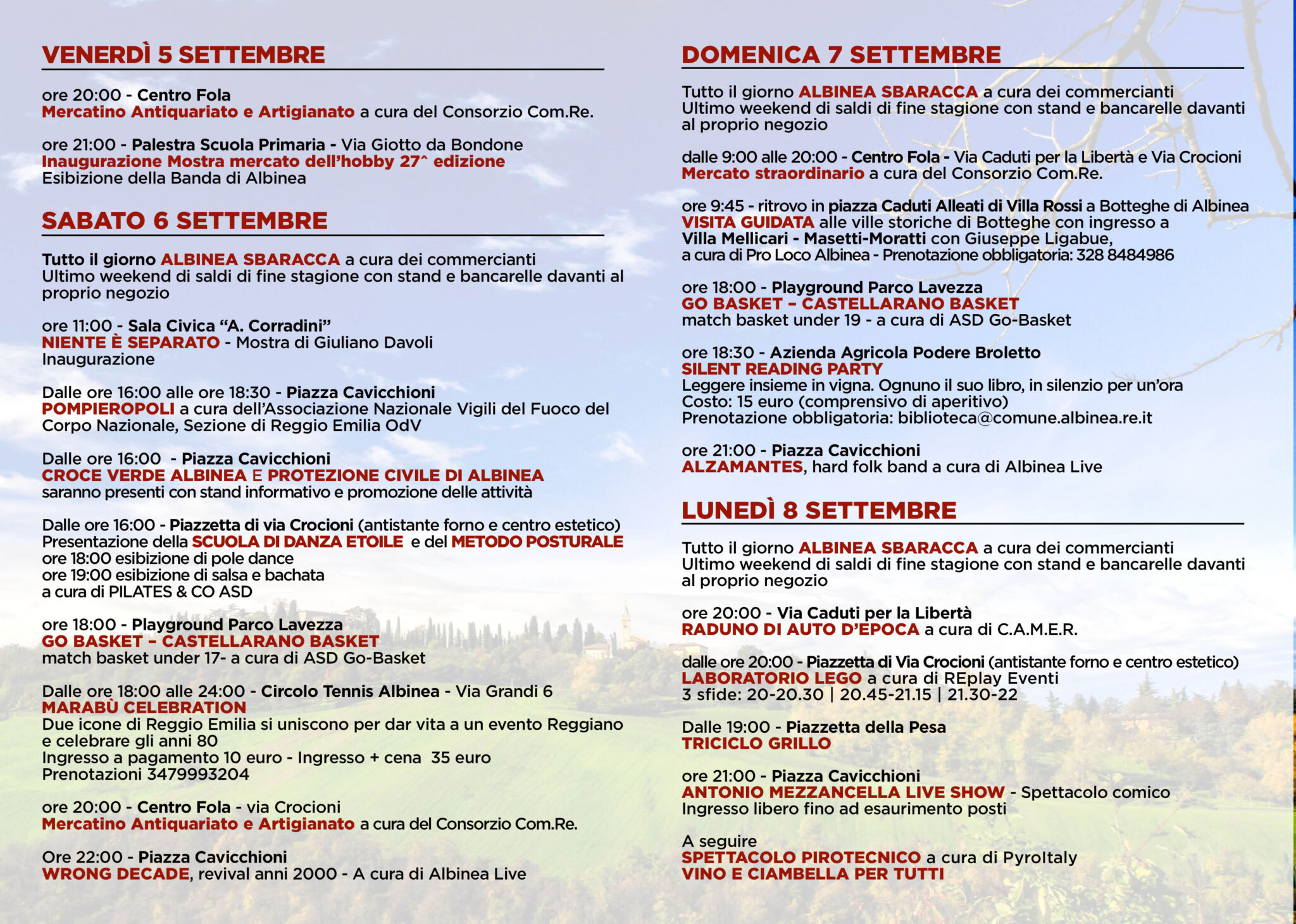 Per informazioni contattare il Comune di Albinea allo 0522.590211, la biblioteca Pablo Neruda allo 0522.590262, oppure la Pro Loco al numero 0522.590266 (www.prolocoalbinea.it).