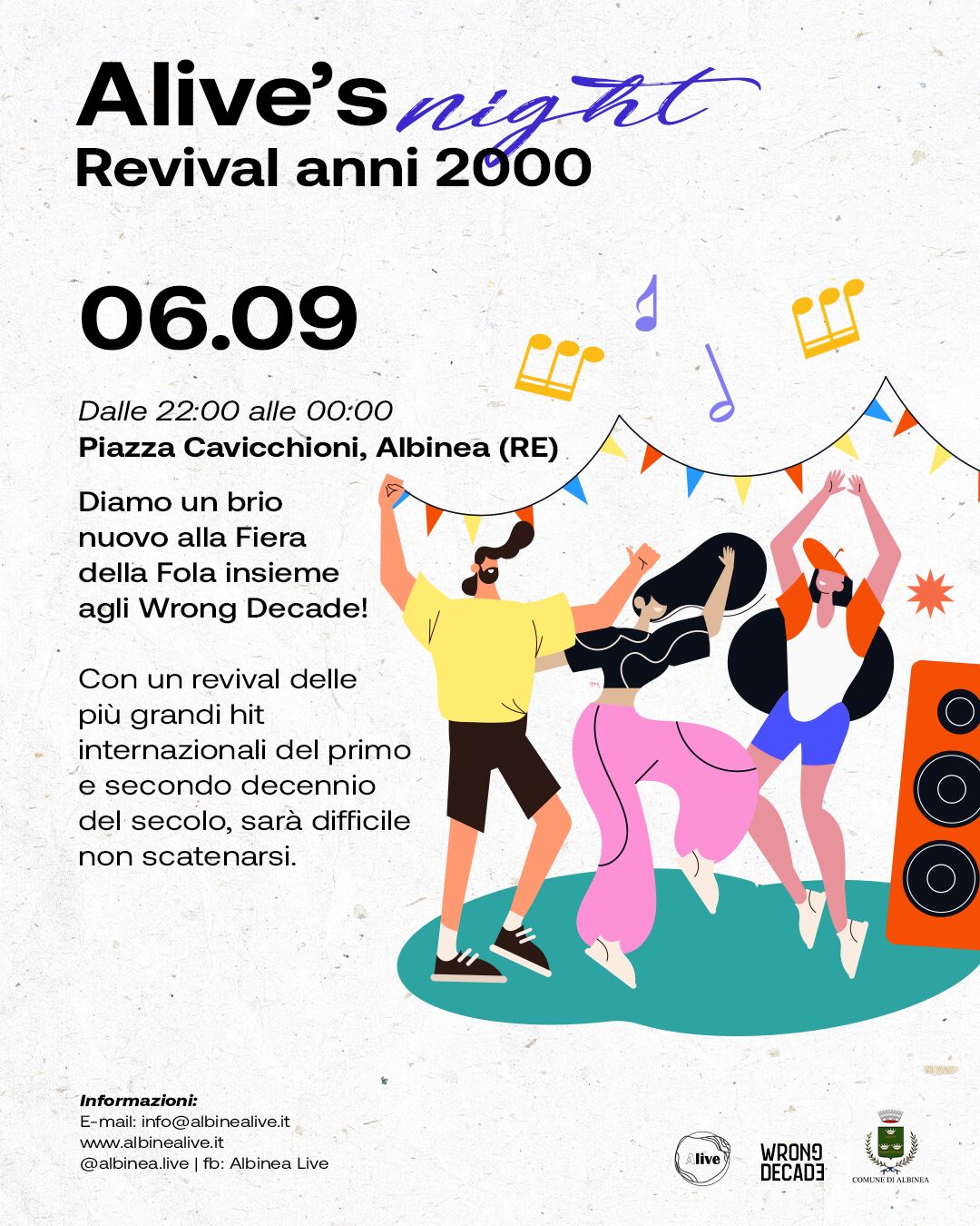 Alle ore 20 ci sarà il mercatino Antiquariato e Artigianato e alle ore 22, in piazza Cavicchioni, “Wrong decade”: un revival anni 2000 a cura di Albinea Live.