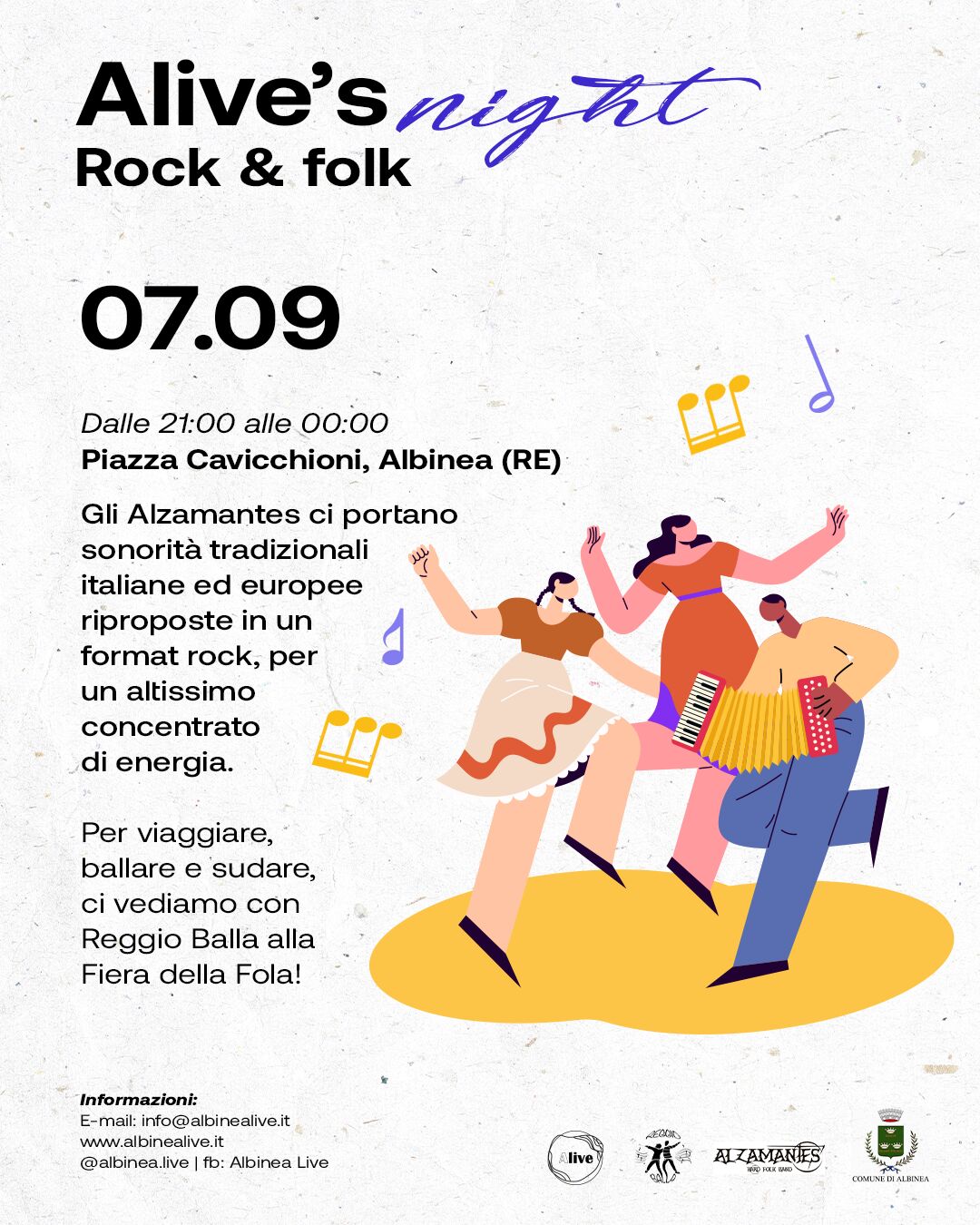 Prenotazione obbligatoria scrivendo a biblioteca@comune.albinea.re.it) . Alle ore 21 musica in piazza con l’hard folk degli “Alzamantes” a cura di Albinea Live.