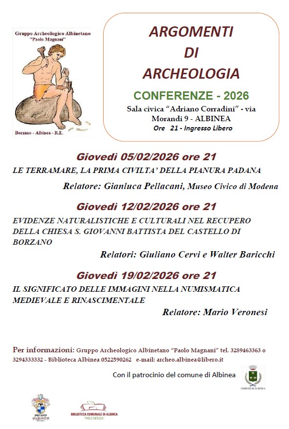 Riprenderanno a partire da giovedì 5 febbraio le conferenze a ingresso gratuito organizzate dal Gruppo Archeologico albinetano con la collaborazione di Comune, biblioteca e Pro Loco. Gli incontri si terranno alle ore 21 nella sala civica di via Morandi 9.