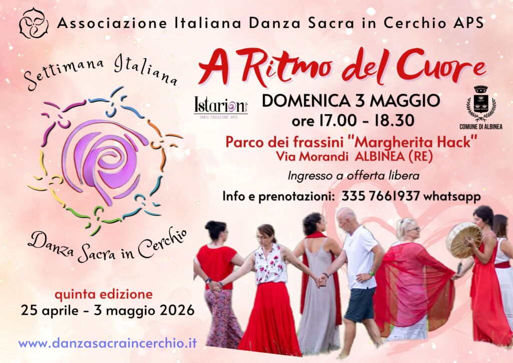 Domenica 3 maggio, dalle ore 17 alle 18.30, al parco dei Frassini, si terrà “A ritmo del cuore”. L’iniziativa è organizzata dall’associazione italiana Danza sacra in Cerchio Aps rientra nella Settimana italiana della danza sacra in cerchio. L’ingresso sarà a offerta libera. Per informazioni e prenotazioni scrivere al 3357661937.