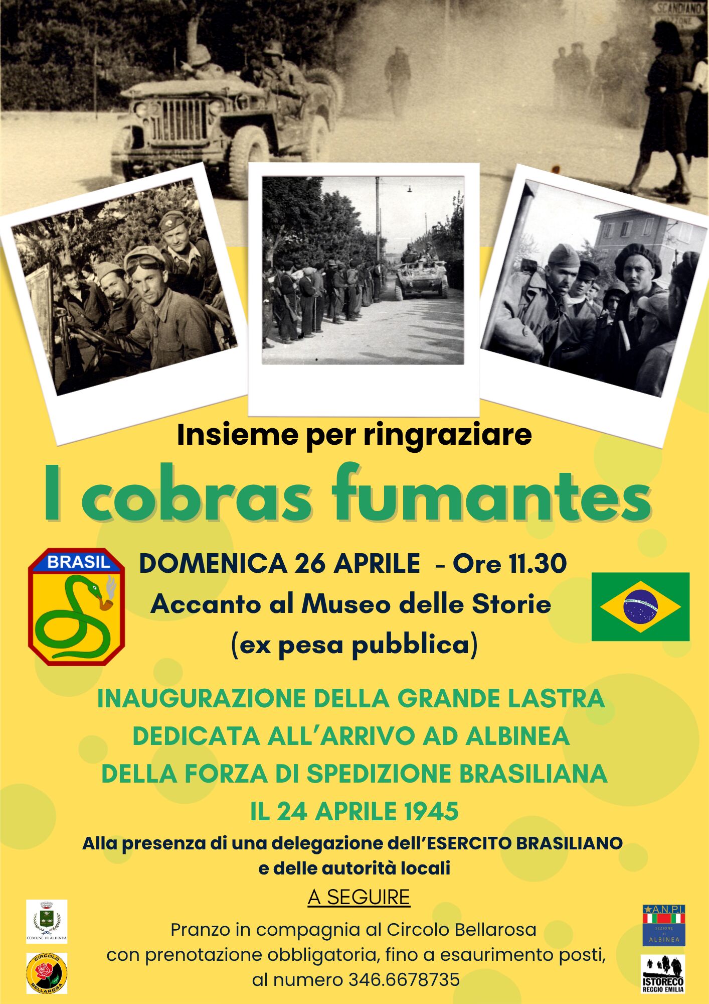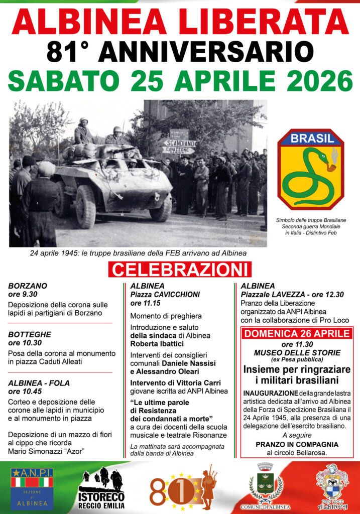 La festa della Liberazione continuerà ad Albinea anche il giorno successivo: domenica 26 aprile con un omaggio ai militari brasiliani della Feb (Força Expedicionária Brasileira) che ebbero un ruolo significativo nella fase finale della Seconda Guerra Mondiale nel reggiano, arrivando in piazza ad Albinea il 24 aprile 1945 insieme ai partigiani.