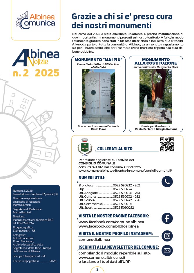 Verrà distribuito nei prossimi giorni, nelle cassette della posta degli albinetani, il periodico comunale Albinea Notizie dell’ottobre 2025.