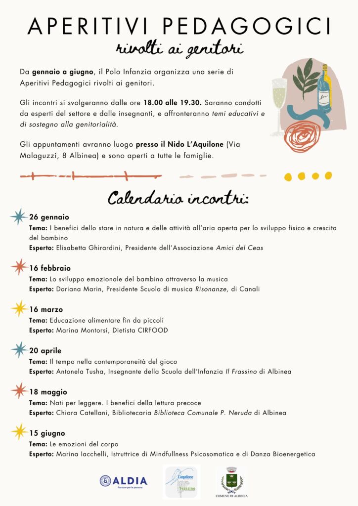 Da gennaio a giugno il Polo Infanzia di Albinea promuoverà un ciclo di “Aperitivi Pedagogici”: incontri dedicati ai genitori e a tutte le famiglie del territorio, con l’obiettivo di offrire spazi di confronto, ascolto e approfondimento sui temi dell’educazione e della genitorialità.