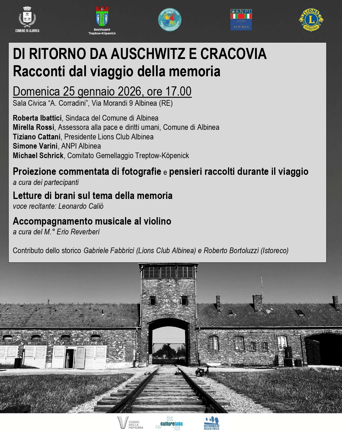 Anche nel 2026, in occasione della Giornata della Memoria che sarà il 27 gennaio, il Comune di Albinea, il Comitato Gemellaggi Pace e Cooperazione internazionale, con la collaborazione di Anpi Albinea, Lions Albinea e Istoreco Reggio Emilia, organizzerà diverse iniziative.
