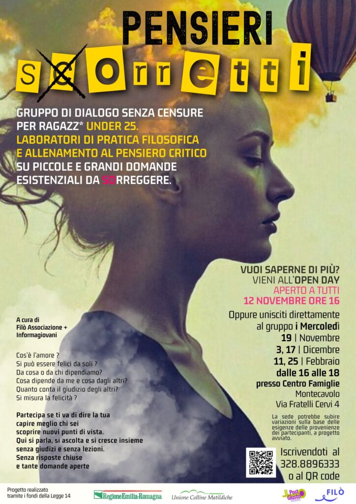 - Per partecipare direttamente al gruppo di dialogo filosofico “Pensieri S©orretti” dai 15 ai 25 anni https://forms.gle/8sDaganJy8DNGxyKA