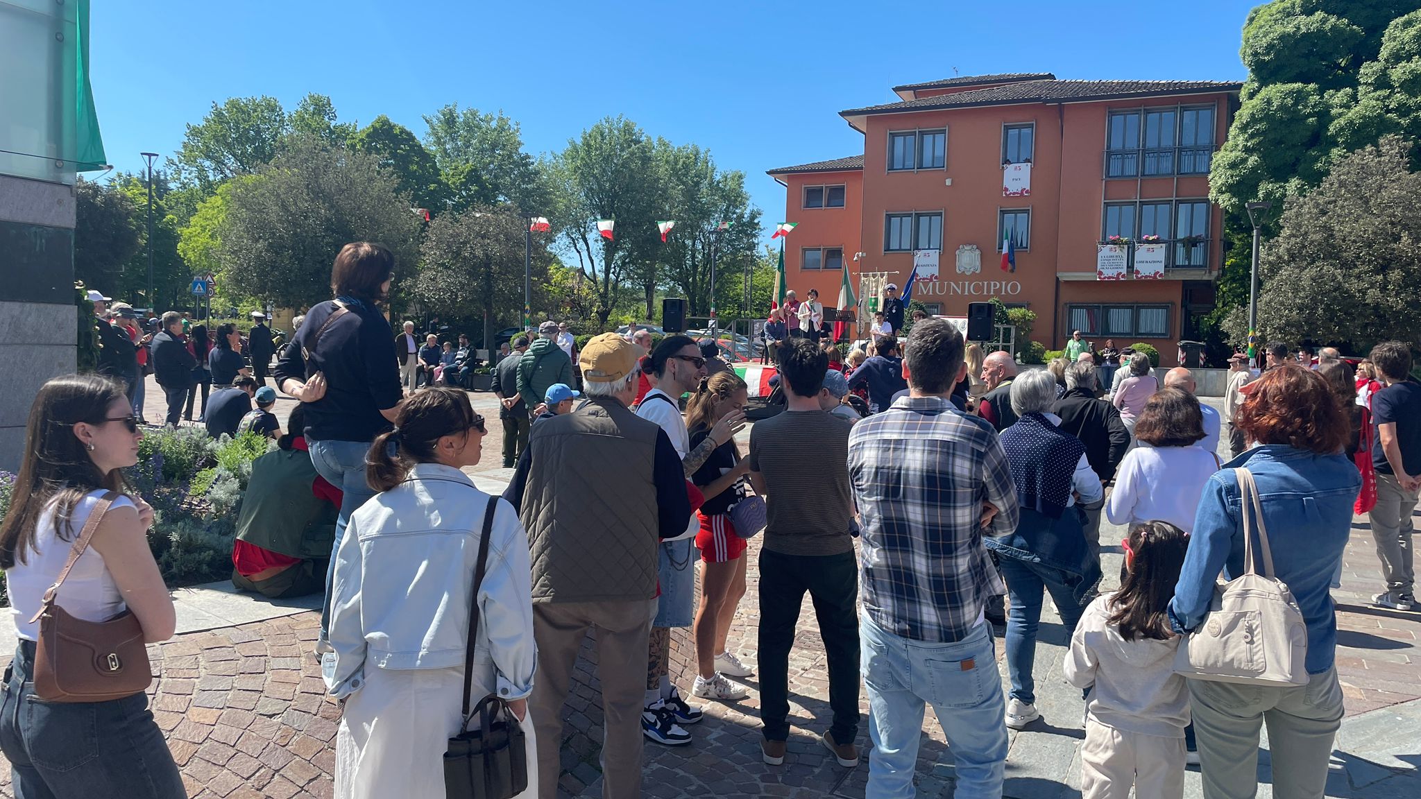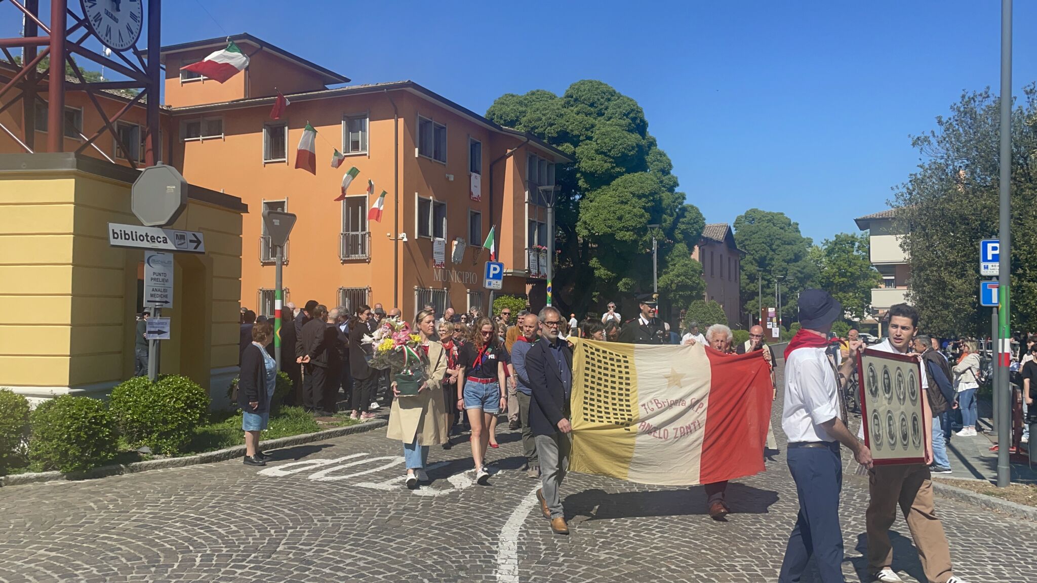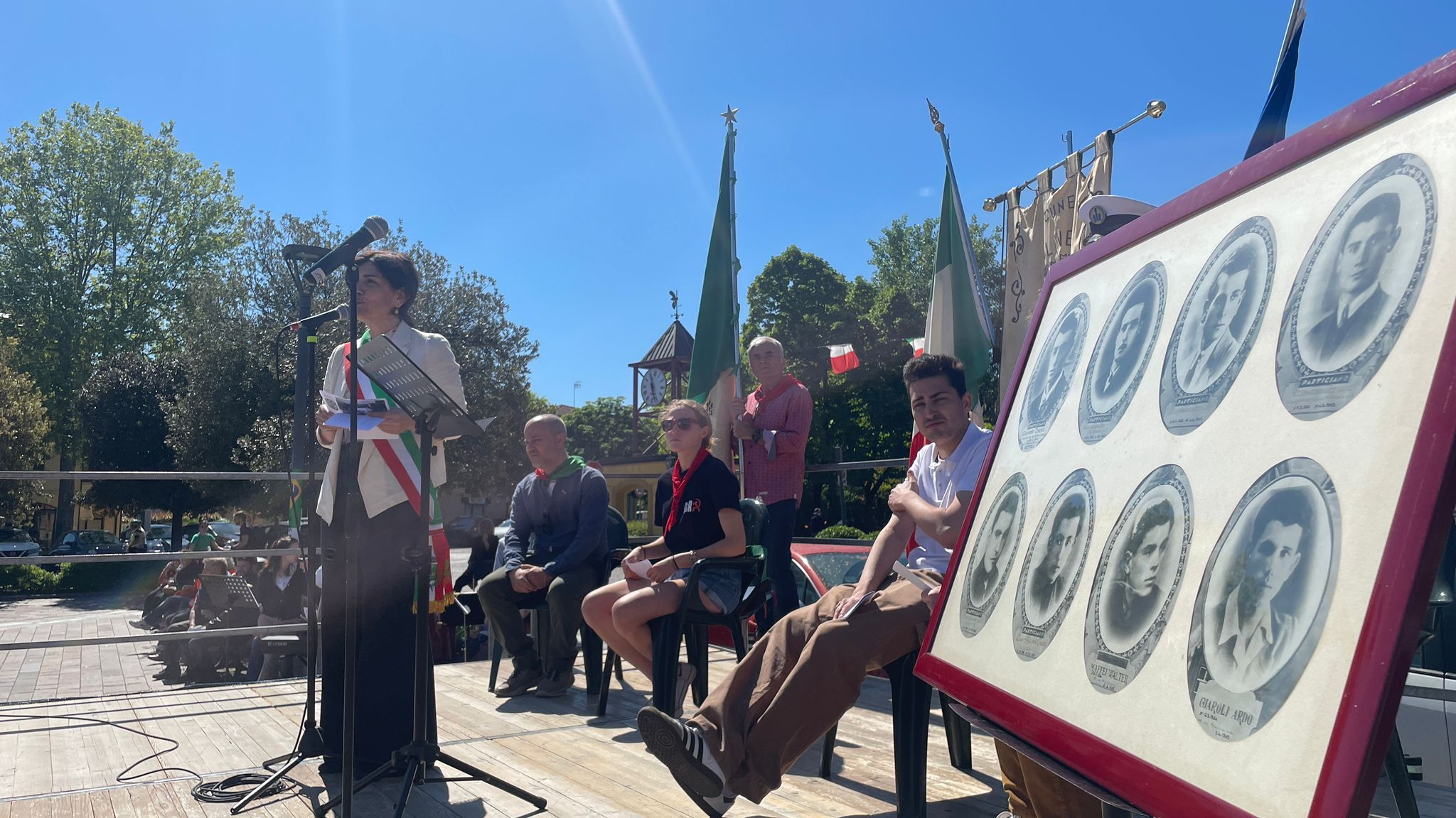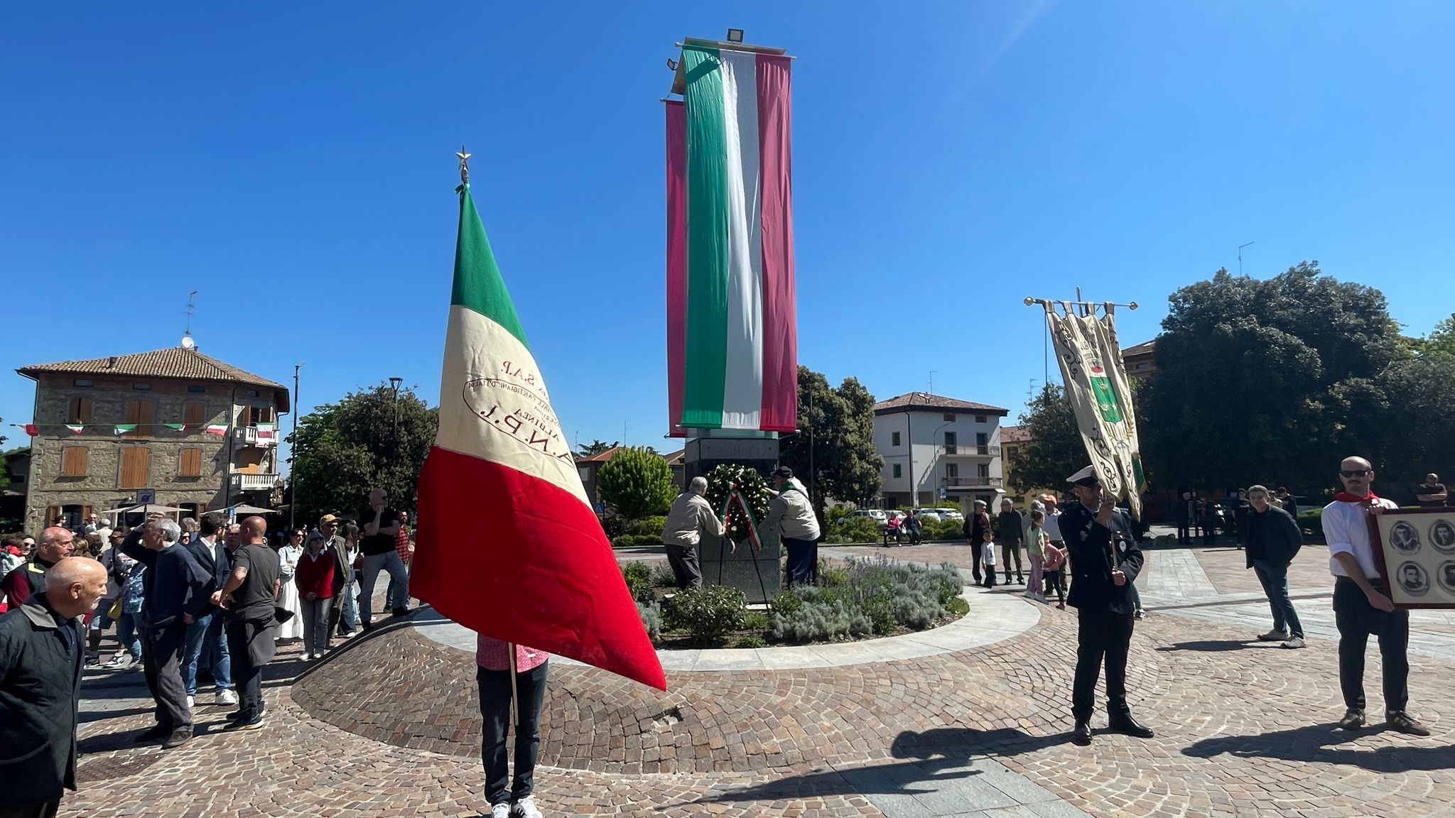 Intorno alla piazza erano ben visibili, appese alle finestre delle abitazioni private e del municipio, le “Parole della Liberazione”.