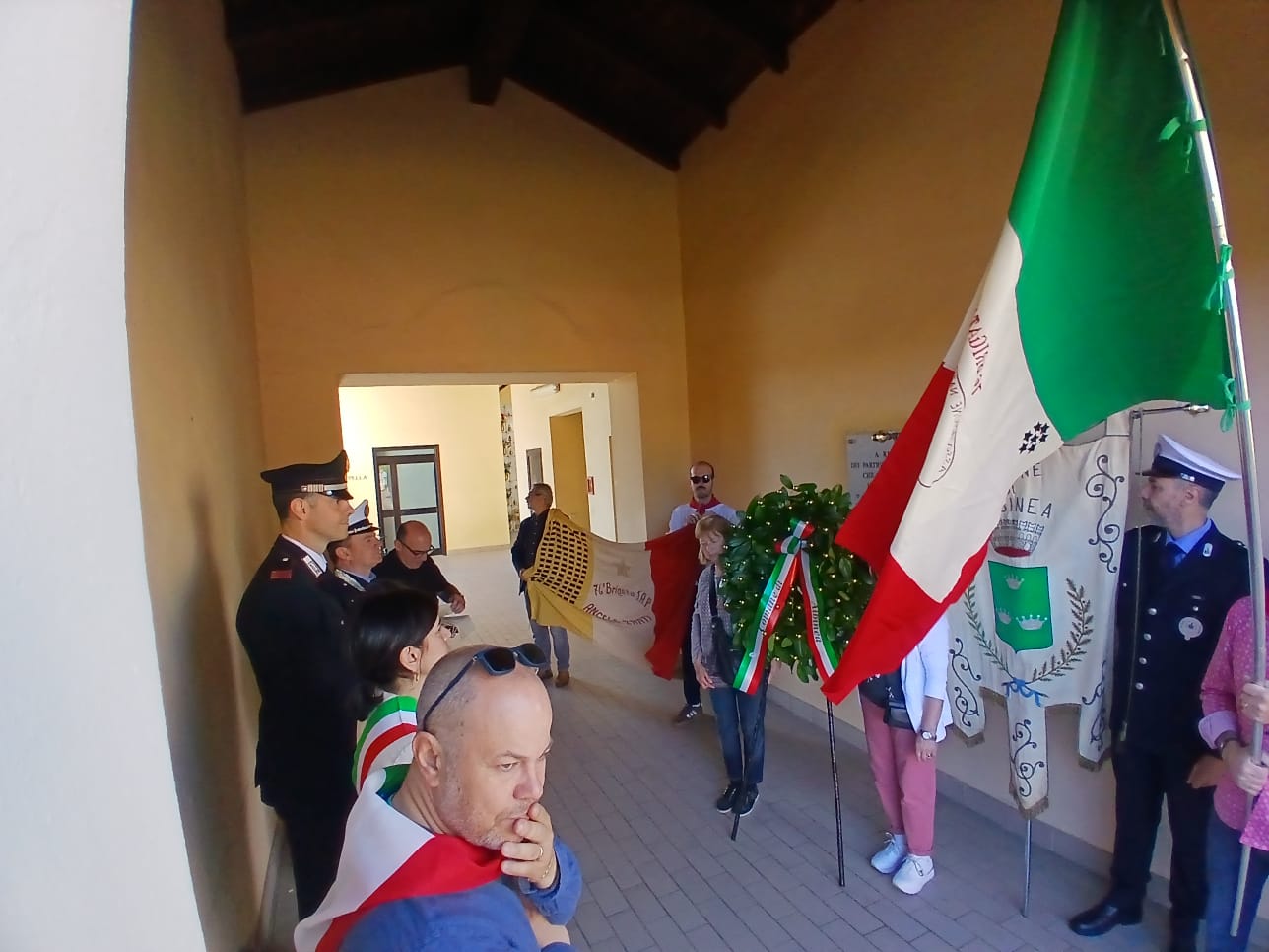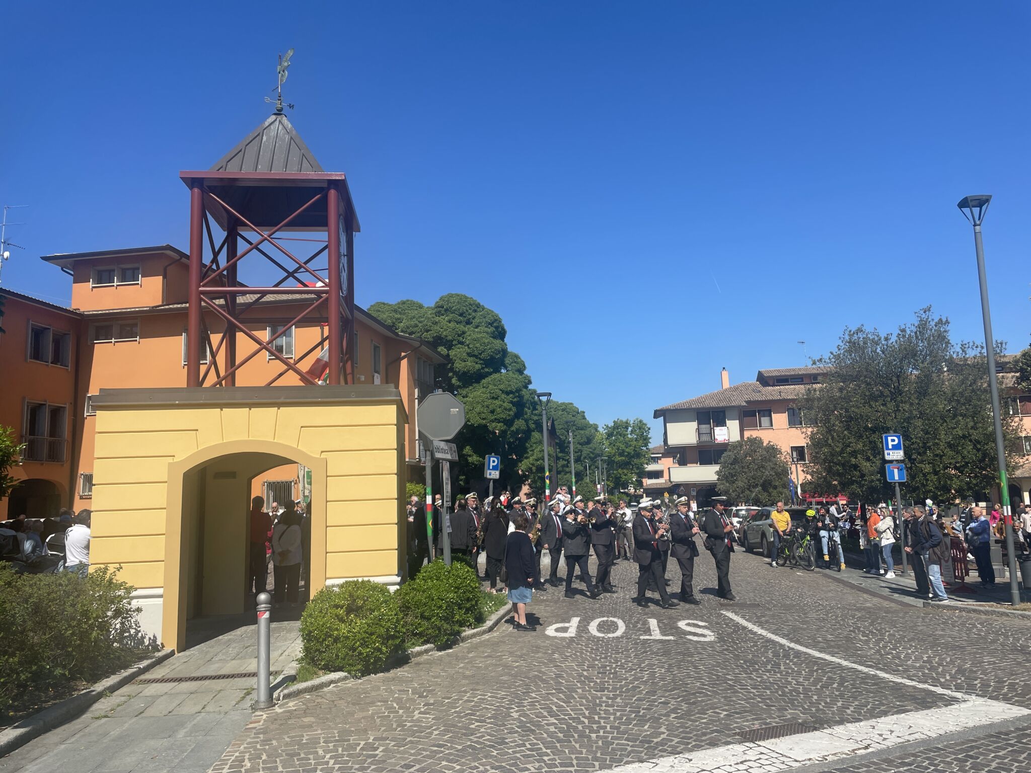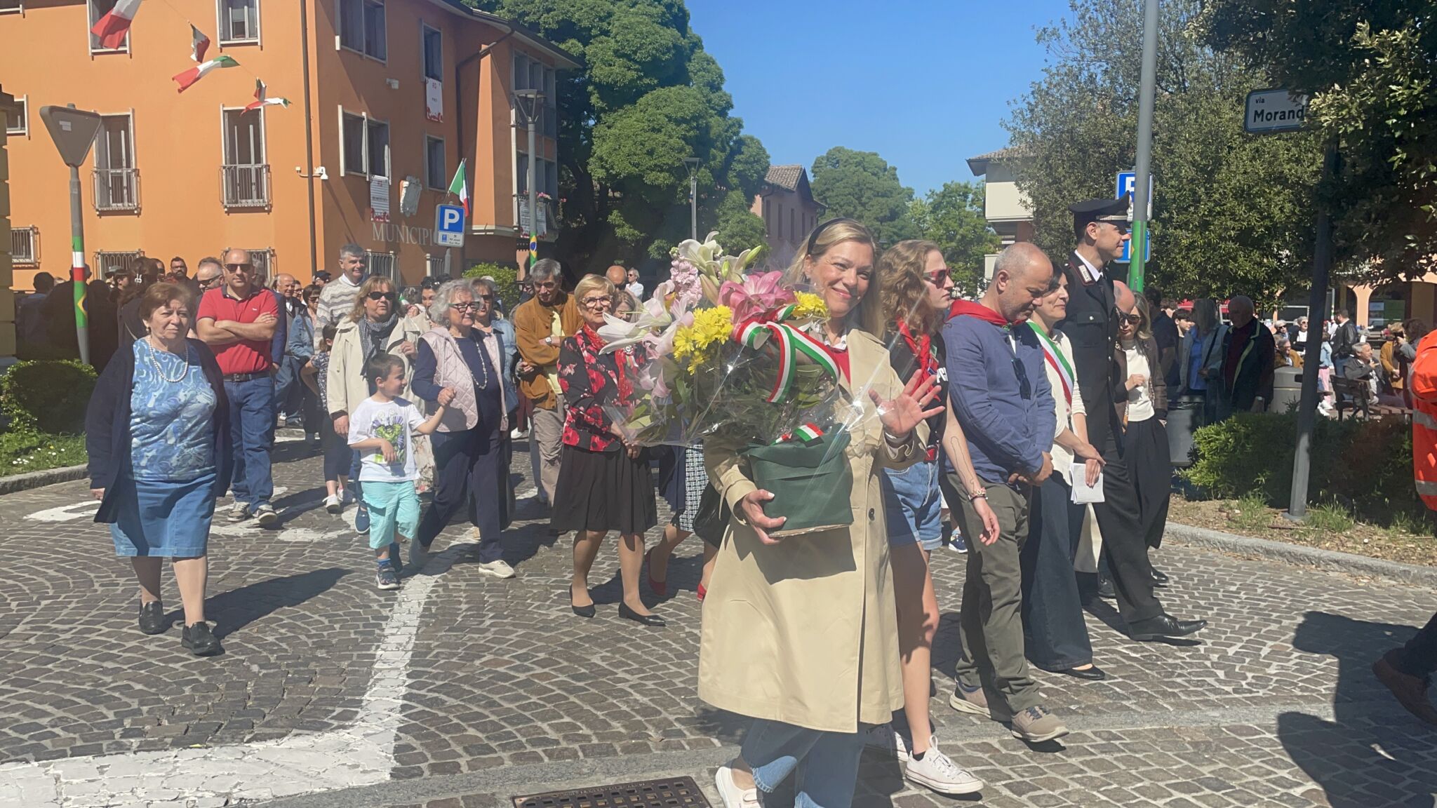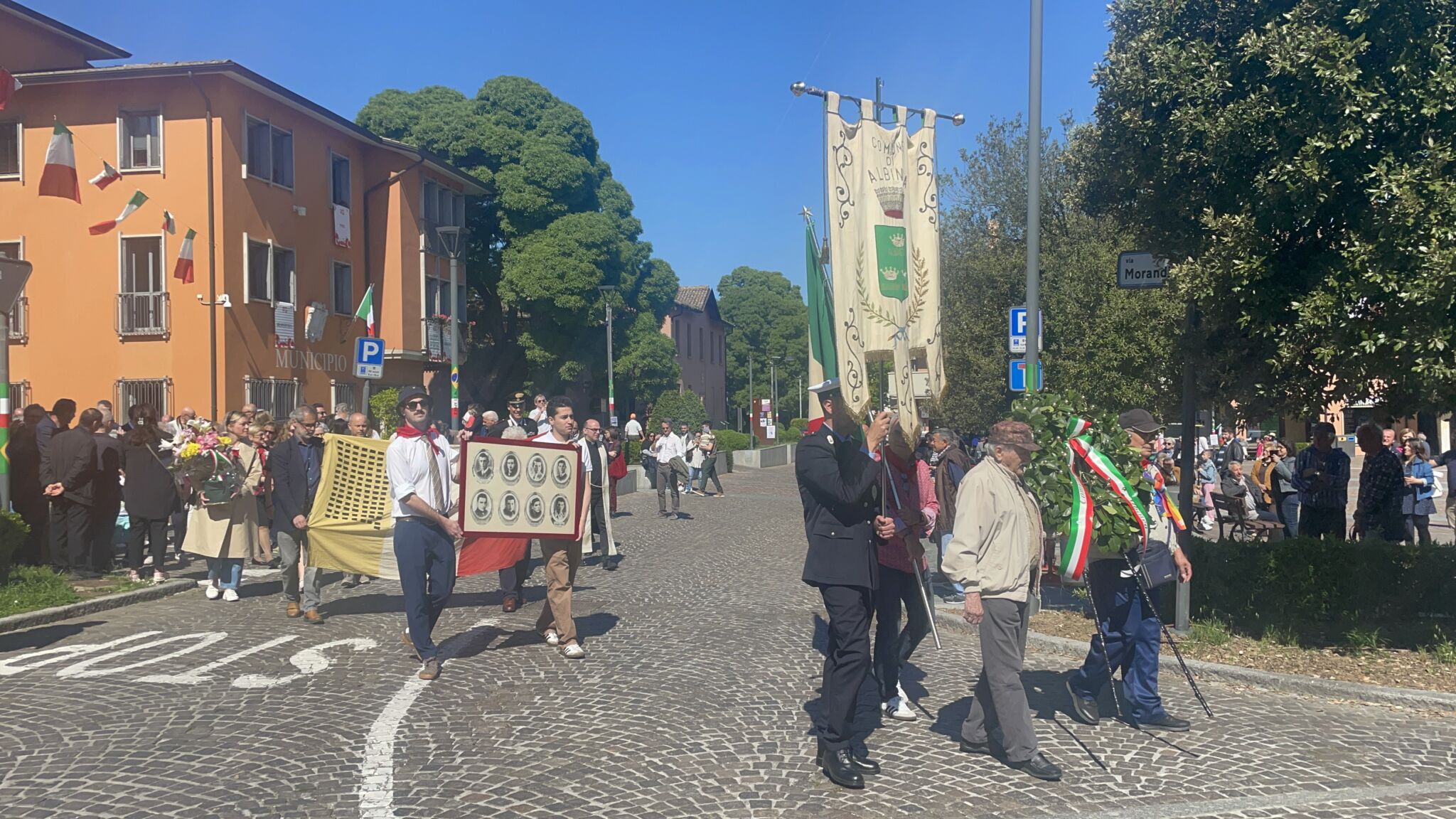 Intorno alla piazza erano ben visibili, appese alle finestre delle abitazioni private e del municipio, le “Parole della Liberazione”.