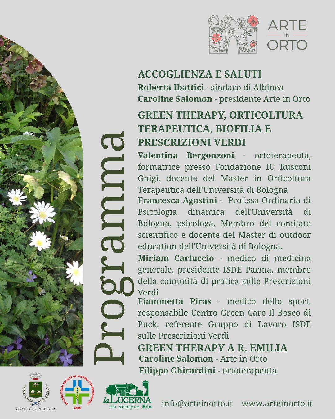 La conferenza si concentrerà su diverse pratiche terapeutiche legate all’ambiente: green therapy, orticoltura terapeutica e prescrizioni verdi attraverso l’intervento di medici, docenti universitari, psicologi, ortoterapeuti e associazioni per raccontare il panorama attuale sia dal punto di vista scientifico che operativo a livello nazionale e, in particolare, nella provincia di Reggio.