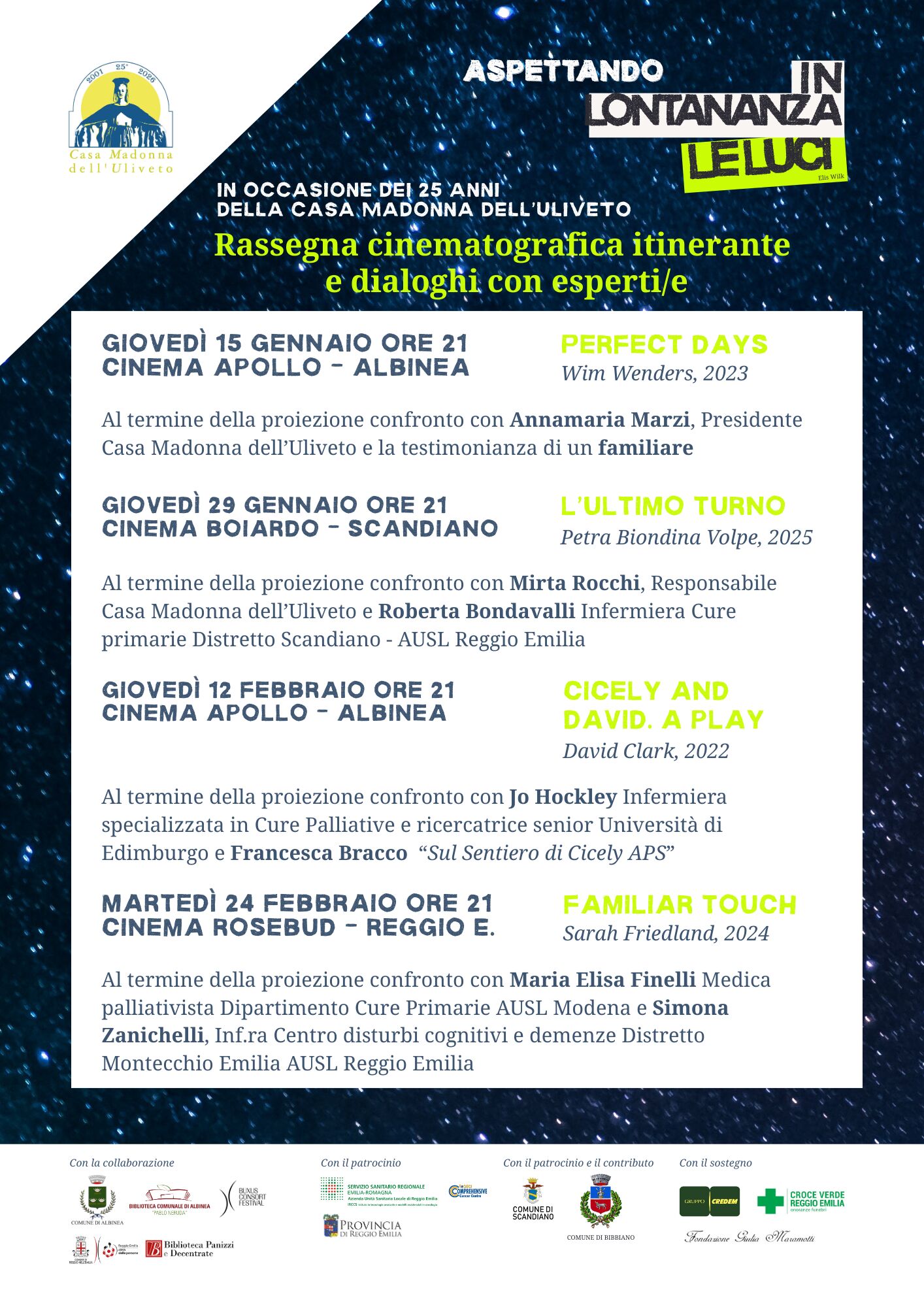 Nel 2026 la Casa Madonna dell’Uliveto – Hospice compie i suoi 25 anni di servizio alla comunità reggiana con 5800 persone assistite, e, in coerenza con il suo stile poco votato alle autocelebrazioni, propone alla città un ricco programma di iniziative culturali e artistiche dal titolo “In lontananza, le luci. Letture, laboratori, spettacoli per prenderci cura del nostro vivere e… morire.”