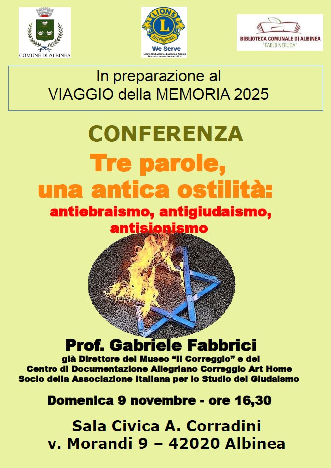 Domenica 9 novembre, alle ore 16.30, ancora in sala civica, ci sarà la conferenza “Tre parole, un’antica ostilità: antiebraismo, antigiudaismo, antisionismo”, con lo storico Gabriele Fabbrici.