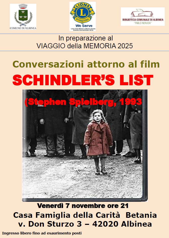 Venerdì 7 novembre, alle ore 21, a Casa Betania (via don Sturzo 2) ci saranno “Conversazioni attorno al film Schindler’s List” di Steven Spielberg, guidate da Tiziano Cattani, conoscitore del tema olocausto e socio del Lions Club Albinea.