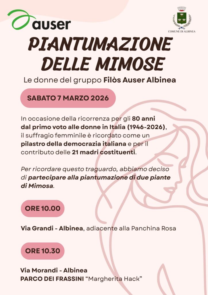 Sabato 7 marzo, in occasione della ricorrenza per gli 80 anni dal primo voto alle donne in Italia (1946-2026), le donne del gruppo Filos Auser Albinea organizzano la piantumazione di due piante di mimosa.