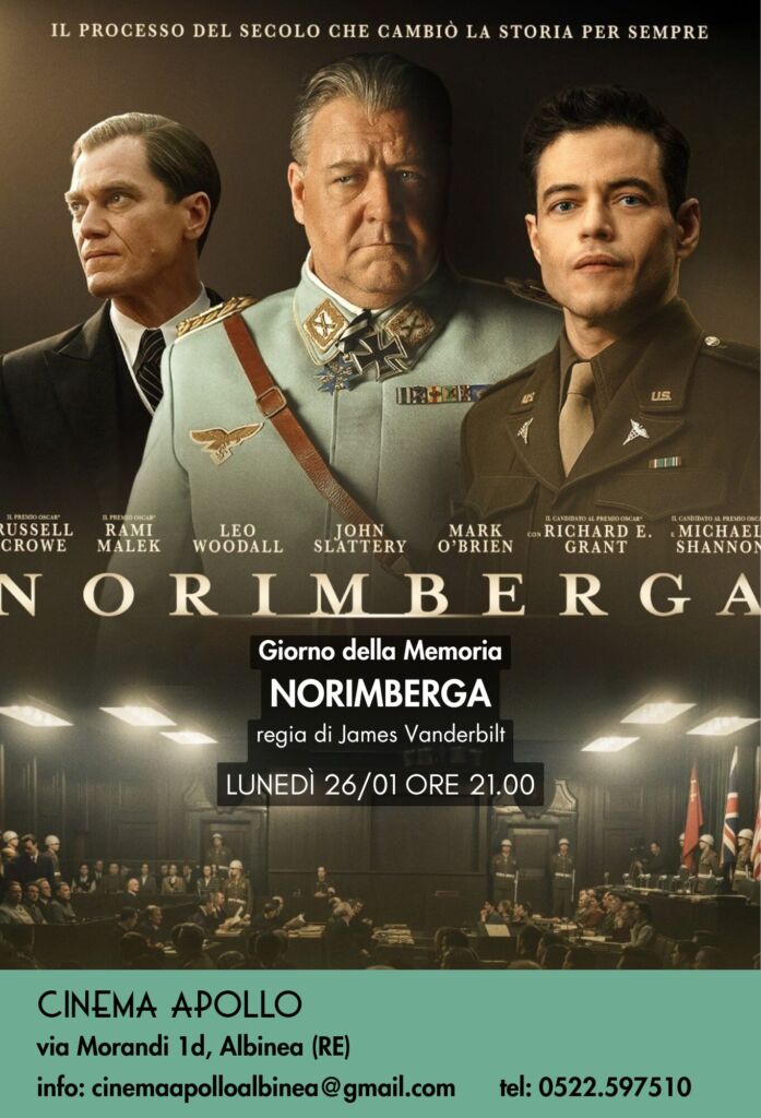 In occasione della Giornata della Memoria, lunedì 26 gennaio, alle ore 21, il cinema Apollo di Albinea trasmetterà il film del 2025 “Norimberga”, sceneggiato, diretto e co-prodotto da James Vanderbilt, basato sul romanzo “Il nazista e lo psichiatra” di Jack El-Hai e interpretato da Russell Crowe.