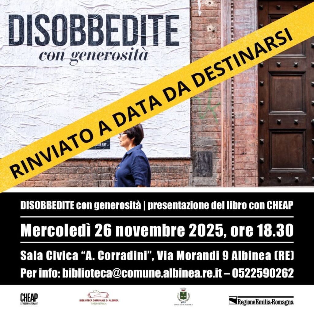 La presentazione di “Disobbedite con generosità” rinviata a data da destinarsi