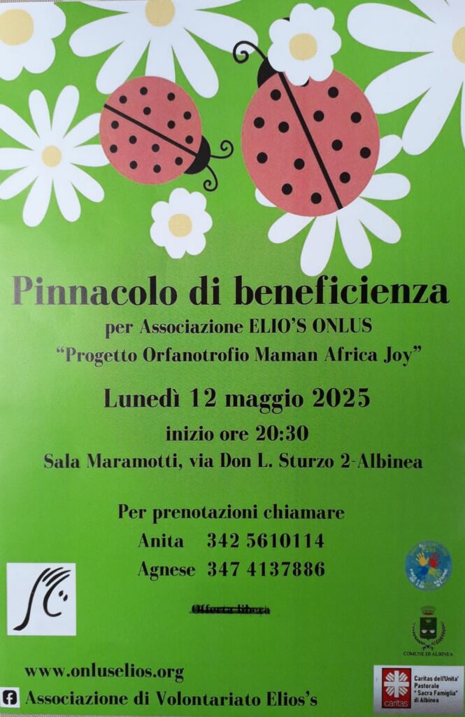 Lunedì 12 maggio, alle ore 20.30, in sala Maramotti (via don Sturzo 2) si terrà un grande pinnacolo di beneficenza in favore dell’associazione Elio’s Onlus e in particolare del progetto “Orfanotrofio Maman Africa Joy”.