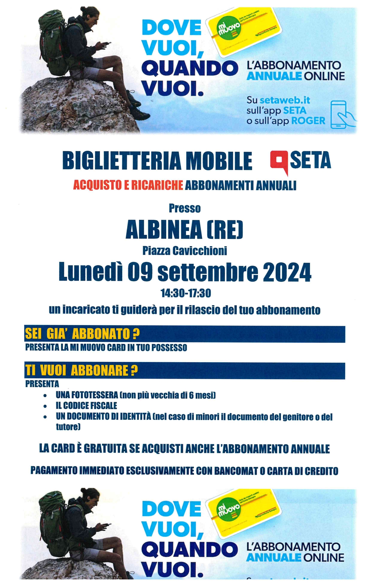 La biglietteria mobile di Seta sarà in piazza Cavicchioni, lunedì 9 settembre dalle 14.30 alle 17.30. Ci sono novità che partiranno dal 16 settembre nel servizio ad Albinea.
