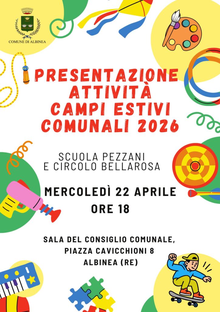 Mercoledì 22 aprile, alle ore 18, nella sala del Consiglio comunale del municipio (piazza Cavicchioni 8) si terrà la presentazione dei due campi gioco comunali del 2026: quello alla scuola Pezzani “Estate a Palla Summer Camp” (gestito dall’Asd Sampolese) dall’8 giugno al 7 agosto e quello al Centro estivo Bellarosa “Alla scoperta della natura animata” (gestito dalla cooperativa Accento e Ecosapiens) dal 29 giugno al 31 luglio e dal 17 agosto all’11 settembre.