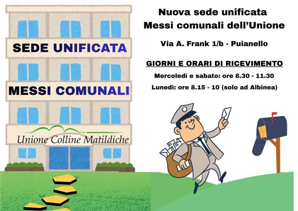 A partire da ottobre 2025 è stata allestita e resa funzionale la nuova sede dei Messi Comunali dell’Unione Colline Matildiche a Puianello (via A. Frank 1/b – A fianco del Comando Polizia Locale UCM)