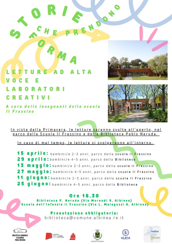 Si tratta di incontri intitolati “Storie che prendono forma”. Letture ad alta voce e laboratori creativi condotti dalle insegnanti nei giorni 15 aprile (piccoli dai 2 ai 3 anni) al parco della scuola d’infanzia, il 29 aprile al parco dei Frassini per piccoli dai 4 ai 5 anni (alle spalle della biblioteca), il 13 maggio (2/3 anni – parco della scuola d’infanzia), il 27 maggio (4/5 anni – Parco dei Frassini), l’11 giugno (2/3 anni – parco della scuola d’infanzia) e il 25 giugno (4/5 anni – Parco dei Frassini).