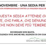 Inoltre l’Assessora alle pari opportunità Jessica Guidetti e la presidente di Auser Albinea Stefania Manenti porteranno ai commercianti del territorio tante rose rosse abbinate al numero antiviolenza 1522. In biblioteca inoltre i commercianti potranno ritirare le targhe del progetto “25 novembre: sedia vuota per la giornata contro la violenza sulle donne” da esporre nel loro esercizio commerciale. La campagna “25 novembre: sedia vuota per la giornata contro la violenza sulle donne”, promossa dal Comune e Unione Colline Matildiche, invita a “segnare” una sedia vuota, nei luoghi pubblici, dedicata alle donne vittime di femminicidio, affinché quell’assenza non diventi mai normalità.
