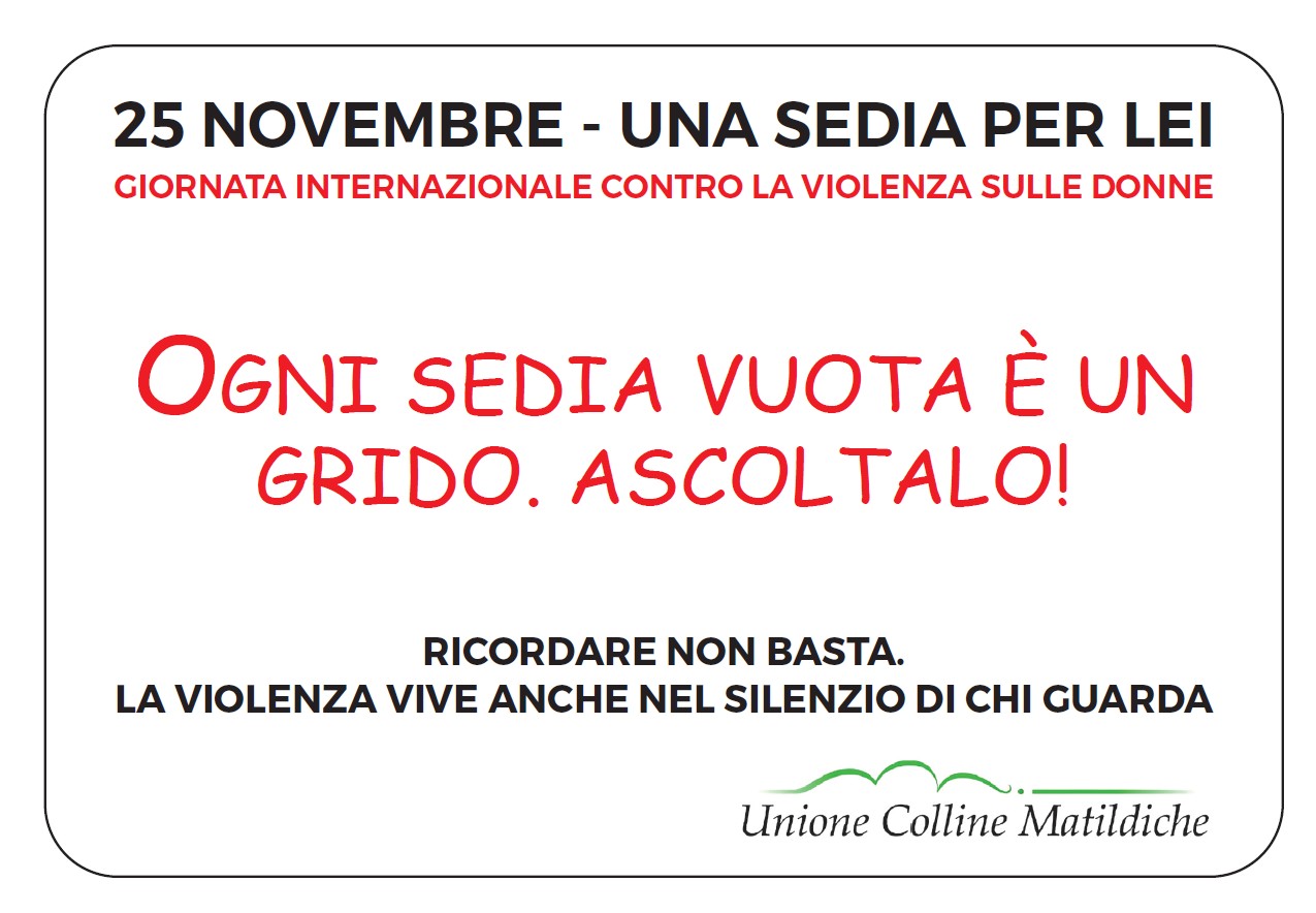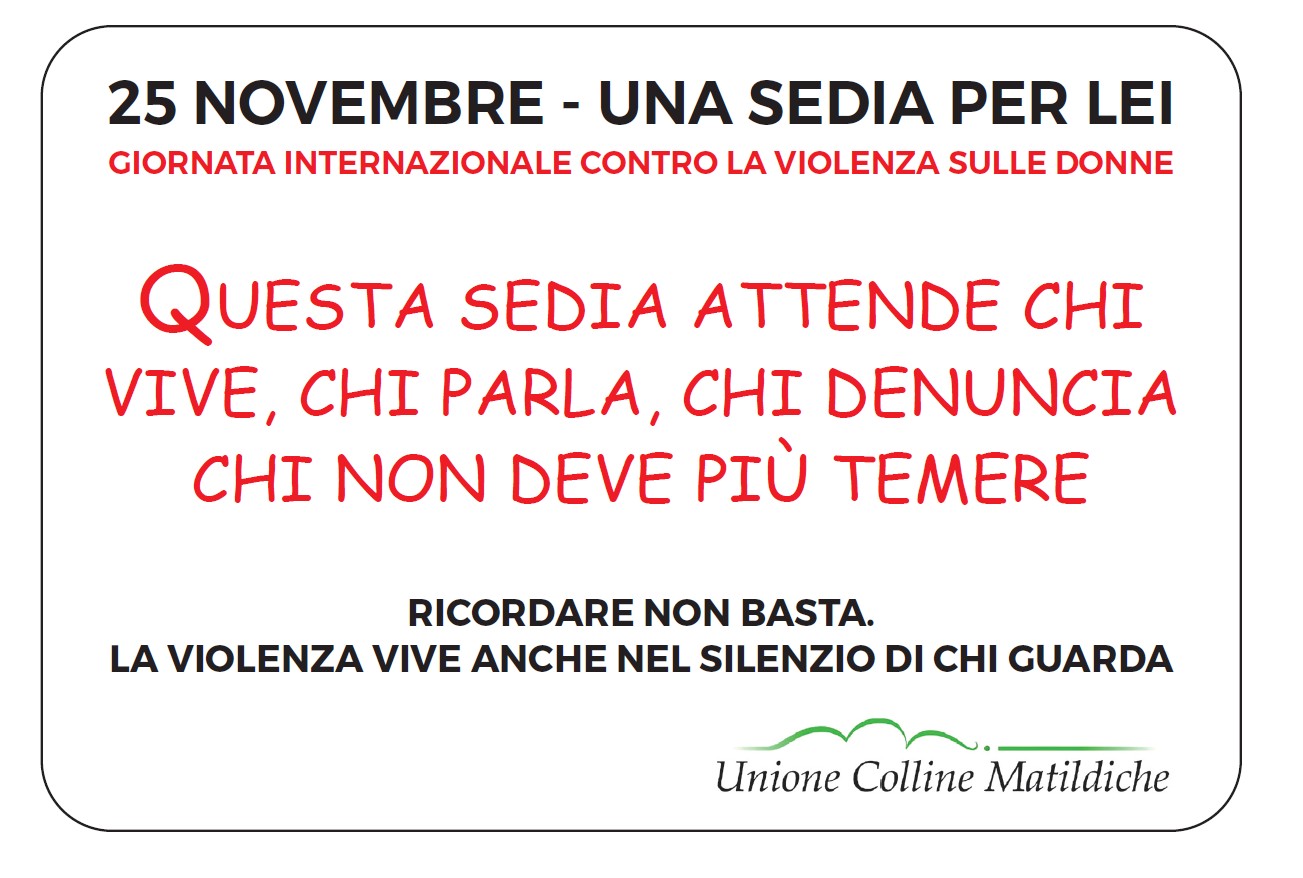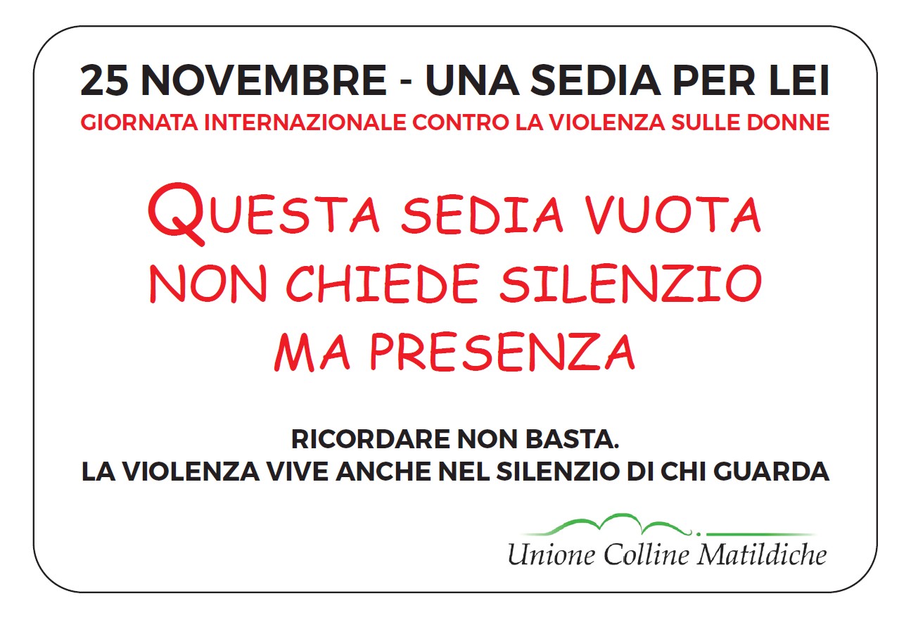 Inoltre l’Assessora alle pari opportunità Jessica Guidetti e la presidente di Auser Albinea Stefania Manenti porteranno ai commercianti del territorio tante rose rosse abbinate al numero antiviolenza 1522. In biblioteca inoltre i commercianti potranno ritirare le targhe del progetto “25 novembre: sedia vuota per la giornata contro la violenza sulle donne” da esporre nel loro esercizio commerciale. La campagna “25 novembre: sedia vuota per la giornata contro la violenza sulle donne”, promossa dal Comune e Unione Colline Matildiche, invita a “segnare” una sedia vuota, nei luoghi pubblici, dedicata alle donne vittime di femminicidio, affinché quell’assenza non diventi mai normalità.
