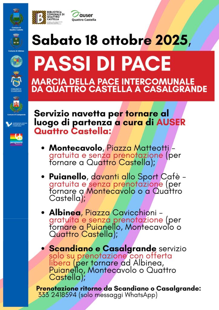 Sabato 18 ottobre si terrà, per il terzo anno, la Camminata intercomunale “Passi di Pace” che attraverserà, per 30 km complessivi, i territori di Quattro Castella, Albinea, Scandiano e Casalgrande.