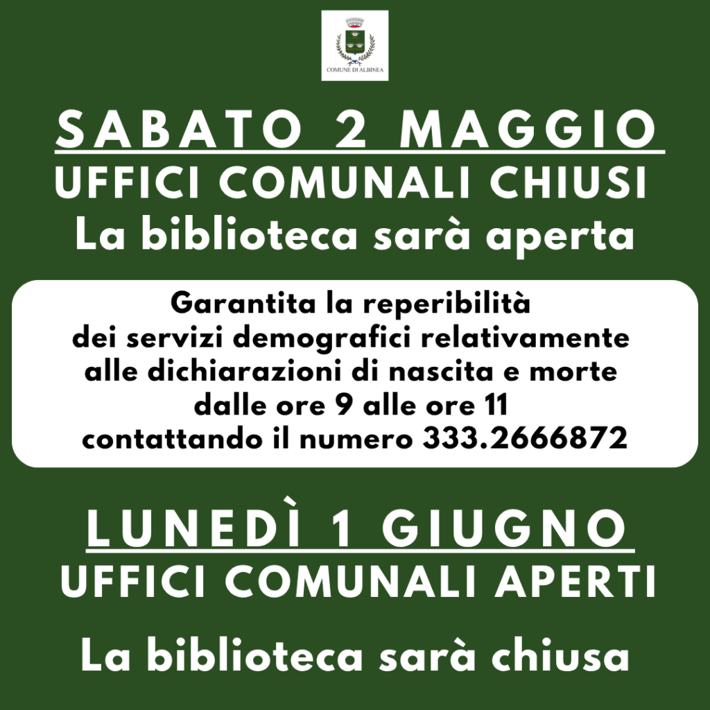 – nella giornata di sabato 2 maggio sarà garantita l’erogazione dei servizi minimi essenziali e la reperibilità dell’Ufficio di Stato Civile limitatamente alle registrazioni di nascita e di morte, dalle ore 9 alle ore 11, contattando il numero 333.2666872.