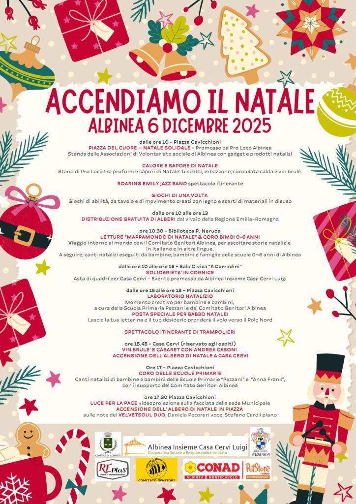Sabato 6 dicembre, a partire dal mattino, la piazza di Albinea sarà il centro di tantissime iniziative che apriranno la stagione del Natale e che culmineranno con l’accensione dell’albero al centro della piazza.