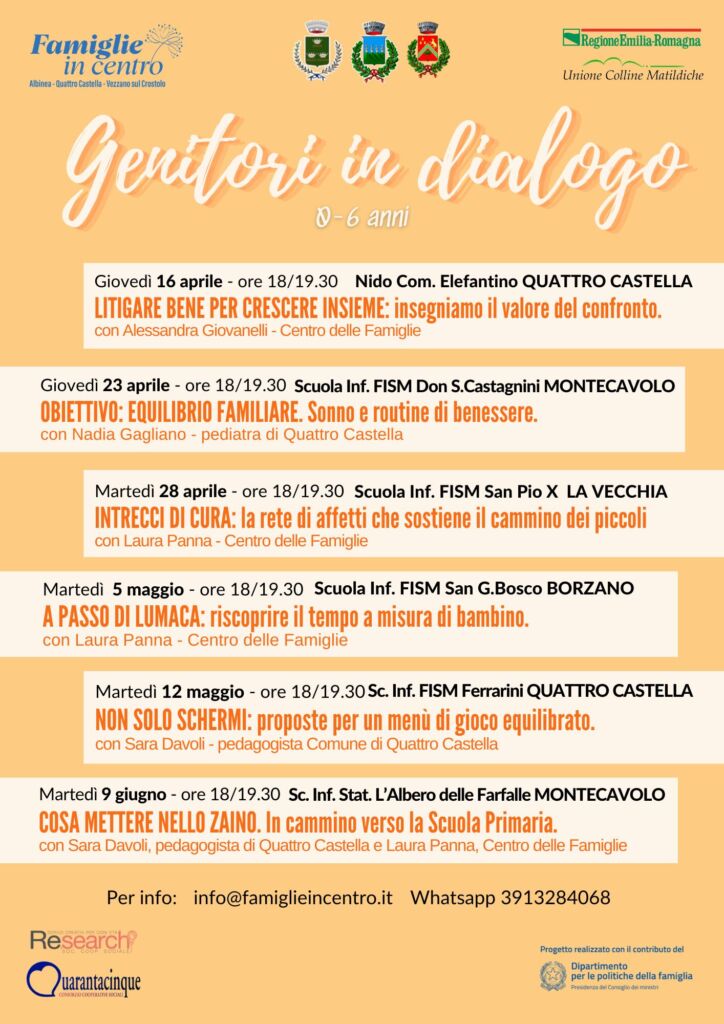 Tornerà con sei incontri, dalle ore 18 alle ore 19.30, la rassegna “Genitori in dialogo”: il ciclo di appuntamenti organizzati dal Centro Famiglie dell’Unione Colline Matildiche (Albinea, Quattro Castella e Vezzano sul Crostolo). Gli incontri, sono dedicati sia ai genitori della fascia 0/6, che a tutta la comunità educante e a chi voglia riflettere e condividere pensieri, idee e promuovere azioni per il benessere dei bambini.