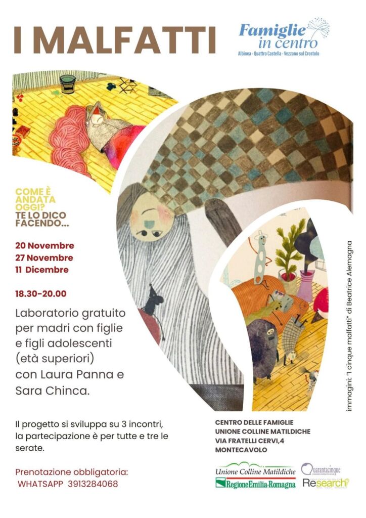 Si intitola “I Malfatti” e il sottotitolo è “Come è andata oggi? Te lo dico facendo” la serie di tre laboratori gratuiti per madri con figlie e figli adolescenti (età delle scuole superiori), organizzati dal Centro Famiglie dell’Unione Colline Matildiche.
