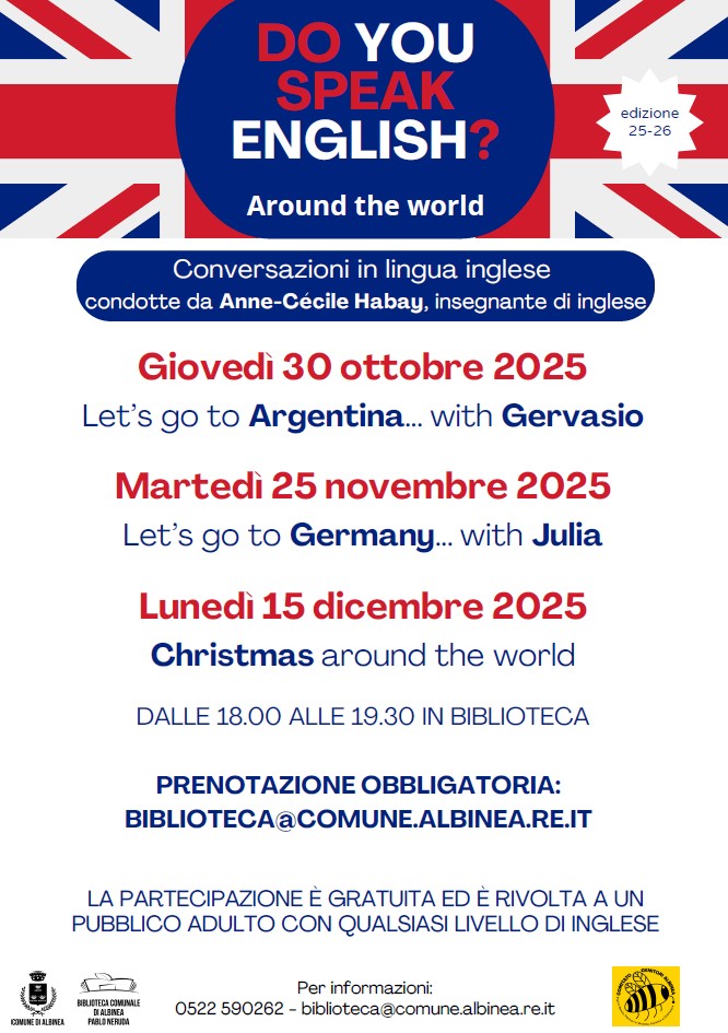 Per partecipare agli incontri (gratuiti) la prenotazione è obbligatoria scrivendo a biblioteca@comune.albinea.re.it ed è aperta agli adulti con qualsiasi livello di conoscenza della lingua inglese.